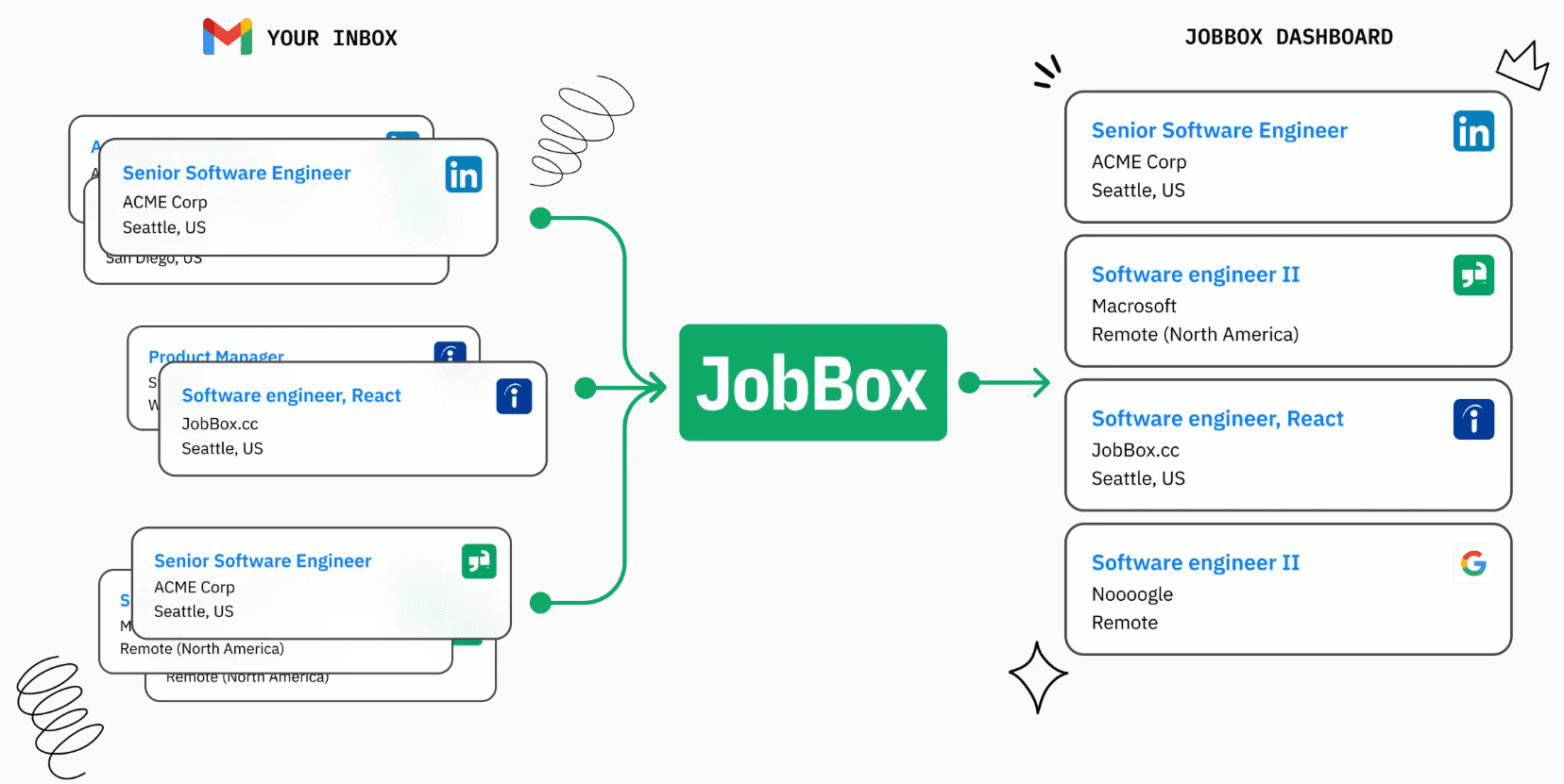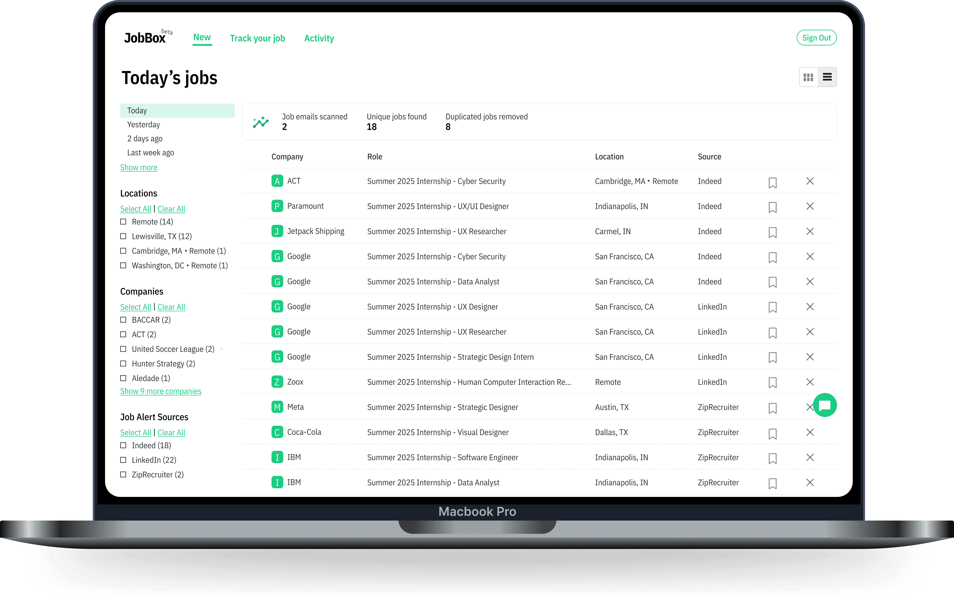 This screen immediately solves the problem of application overwhelm by consolidating job listings from a user's favorite sites (like Indeed and LinkedIn) into a single, clean feed. Users can quickly filter the list and see a count of unique jobs discovered, reducing the noise of duplicate posts and letting them feel more in control of the market.