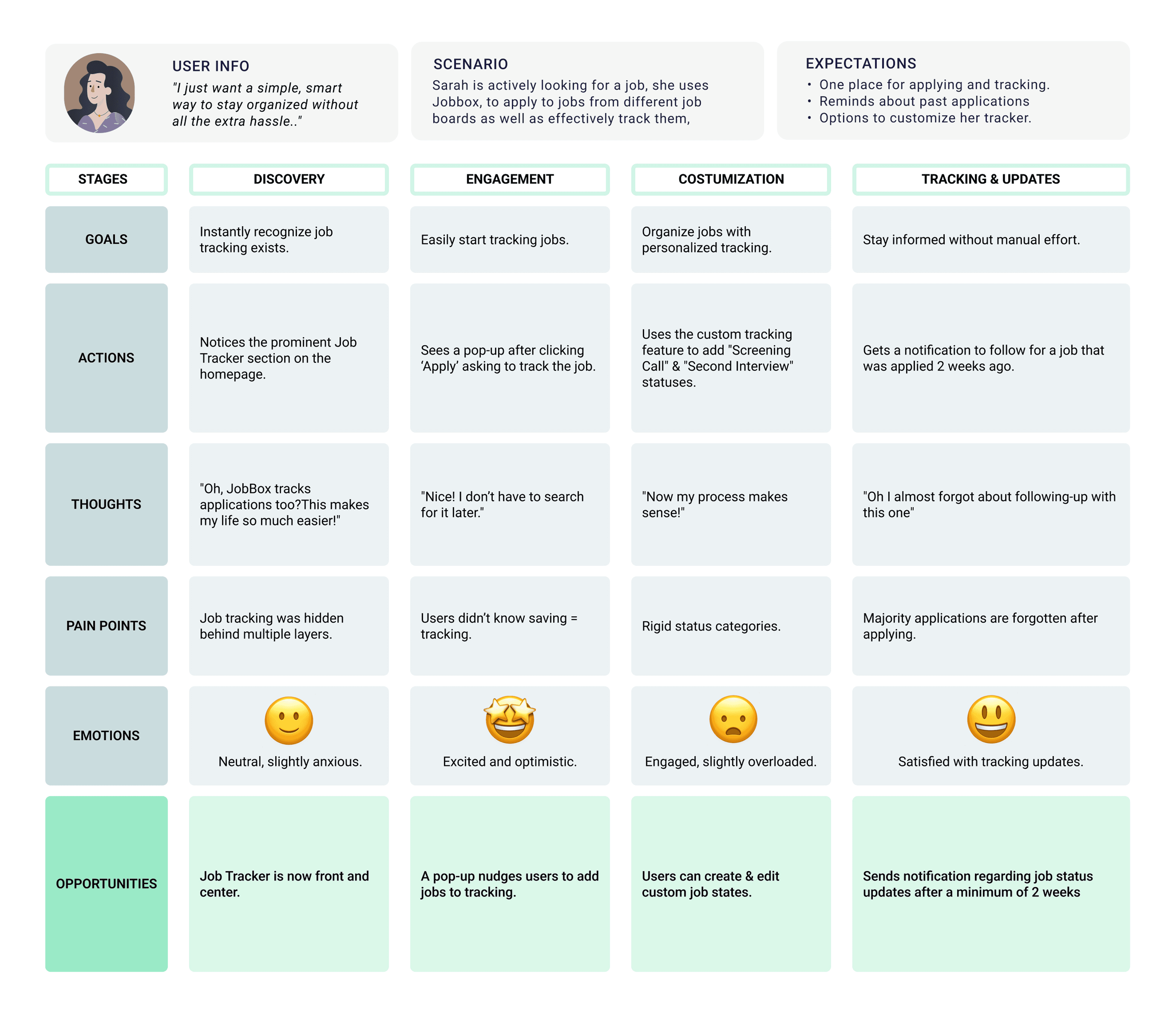 To build a product that truly helps, I first needed to understand who I was helping. Meet Sarah, a dedicated job seeker whose experiences and frustrations guided my design process. By stepping into her shoes, I aimed to design a solution tailored to real-life needs.