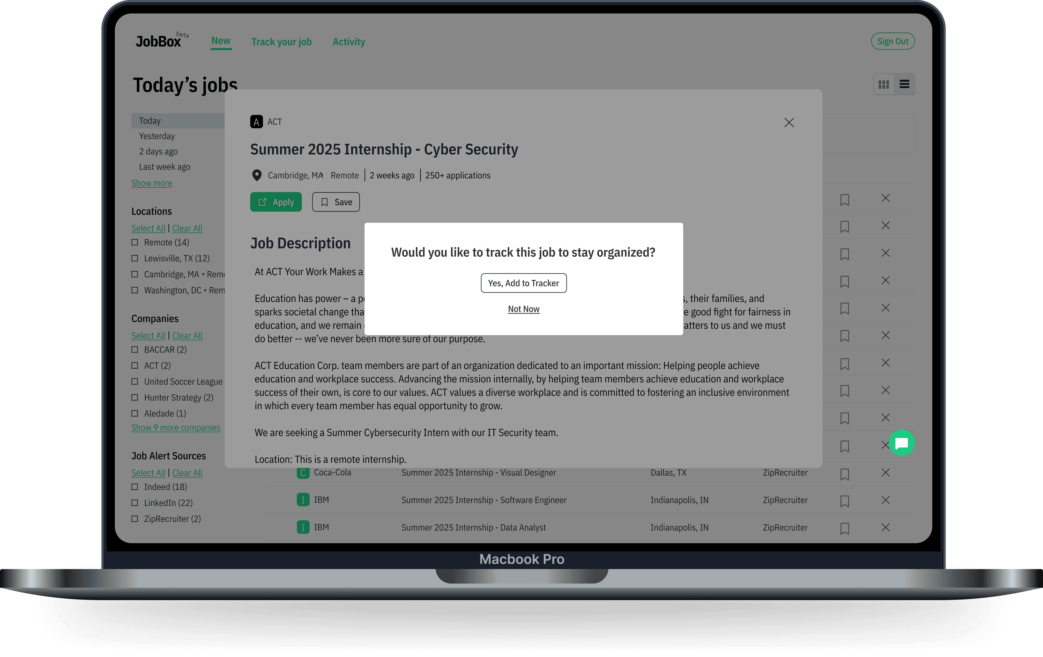When a user clicks a job, they see the full description. Crucially, a proactive pop-up appears asking, "Would you like to track this job to stay organized?" This solves the problem of manual tracking by creating an immediate and simple call-to-action (CTA), making it impossible to forget to add the job later.